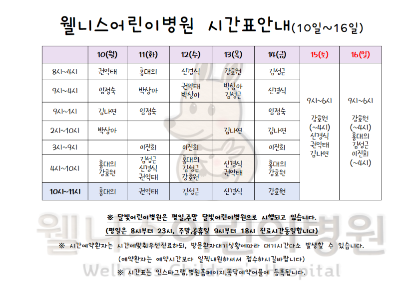 11월10일~16일 시간표입니다. > 월 진료 시간표