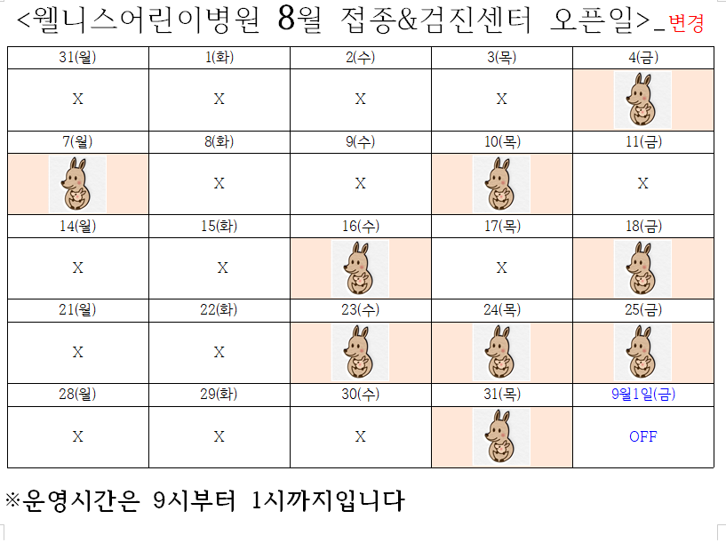 8월 영유아&예방접종센터 오픈일정안내 > 월 진료 시간표