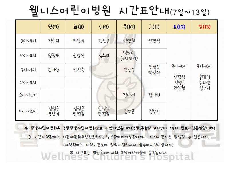 8월7일~13일까지시간표입니다. > 월 진료 시간표