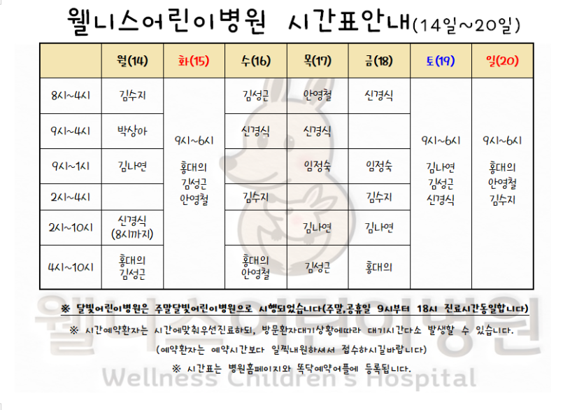 8월14일~20일 시간표입니다. > 월 진료 시간표