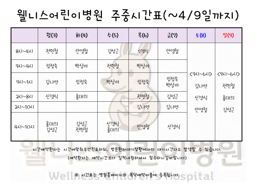 4월 3일~4월 9일 시간표 안내 > 월 진료 시간표