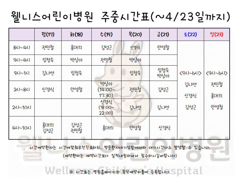 4월17일~4월23일 시간표 안내 > 월 진료 시간표