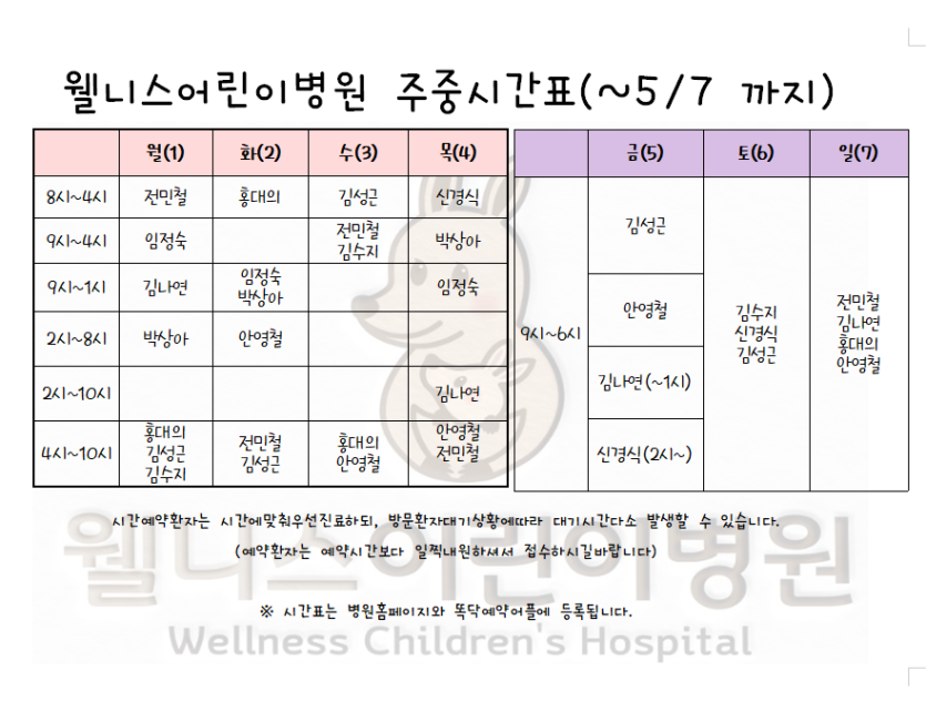 5월 1일~5월7일 시간표 안내 > 월 진료 시간표