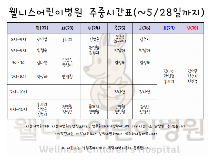 5월22일~5월 28일 시간표 안내 > 월 진료 시간표