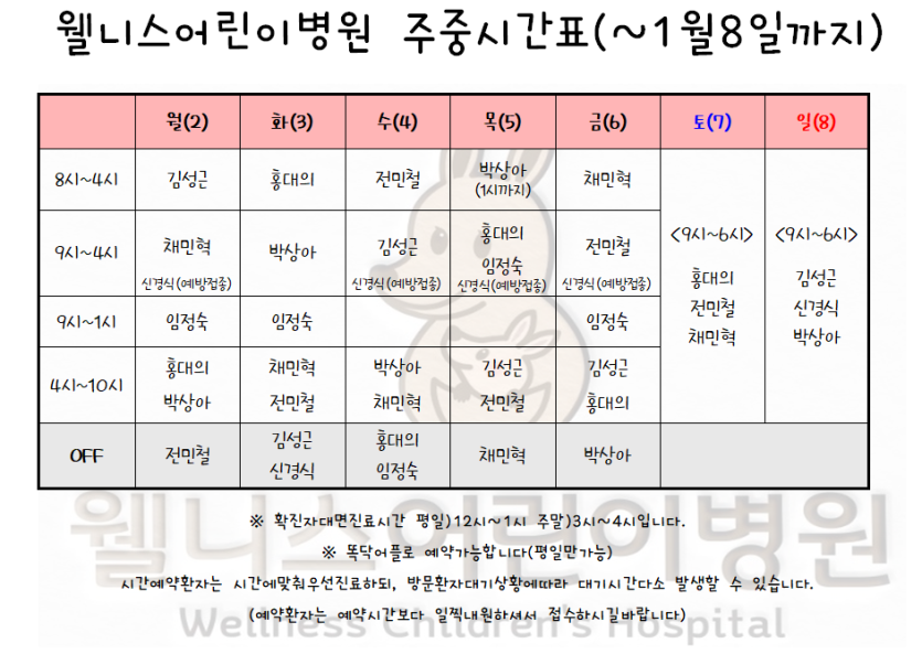 1월2일~1월8일 웰니스어린이병원시간표입니다.