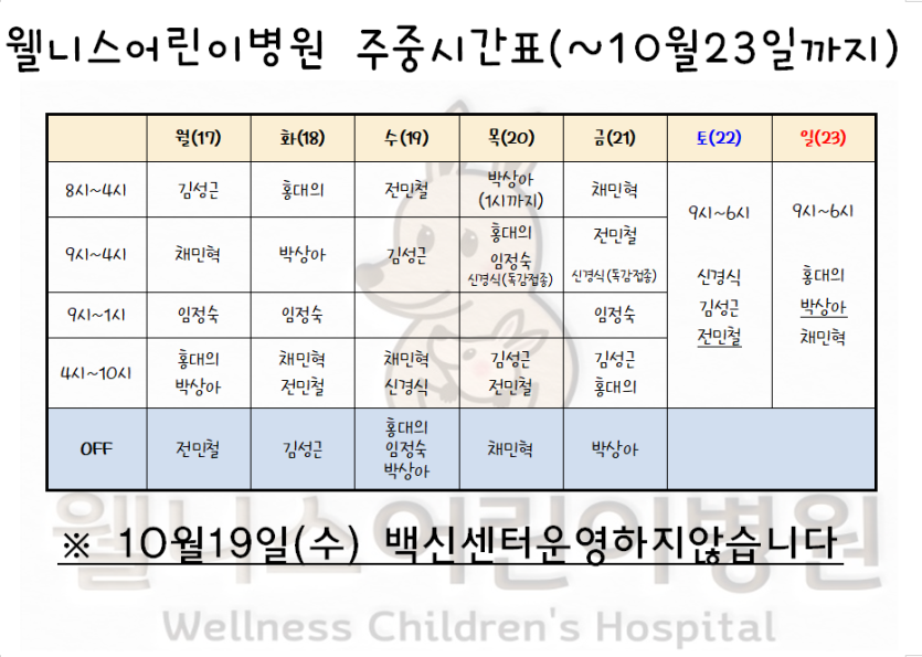 10월19일(수요일)만 병원사정에의해 백신접종센터운영하지않으므로 본관에서 접종같이시행합니다