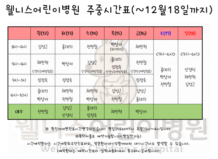 12월12일~12월18일시간표입니다. > 월 진료 시간표