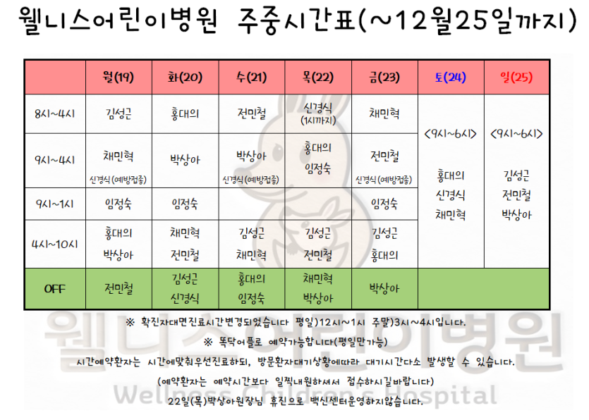 12월19일~12월25일시간표입니다. > 월 진료 시간표