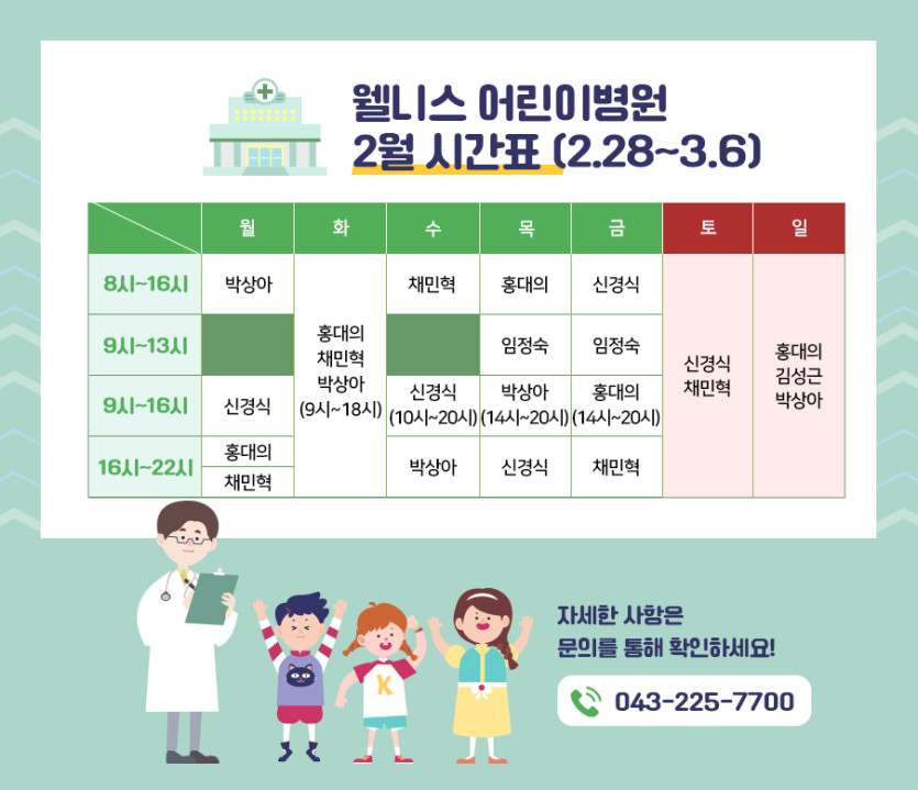 웰니스어린이병원 2022년 2월~3월 진료시간표(2월 28일~3월 6일)입니다.