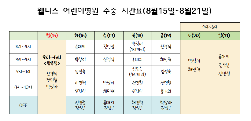 8월15일~8월21일 시간표 > 월 진료 시간표