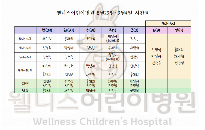 8월29일~9월4일 진료시간표입니다.