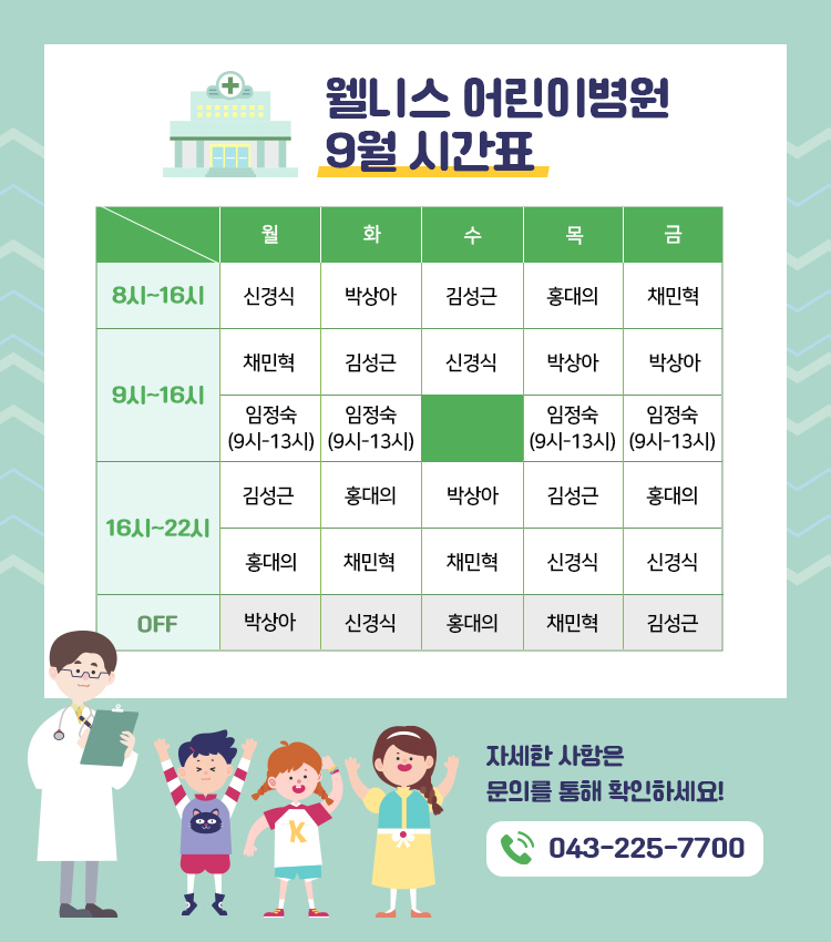 웰니스어린이병원 2021년 9월 진료시간표입니다.