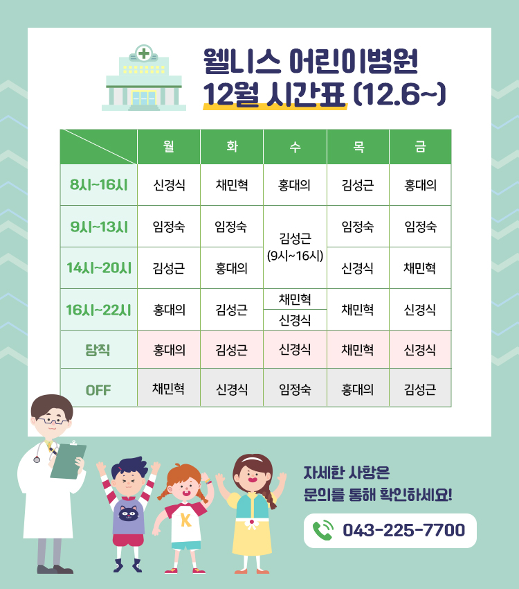 웰니스어린이병원 2021년 12월 진료시간표입니다.