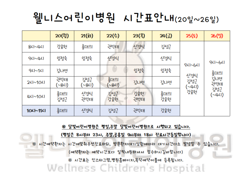 10월 20일~ 26일 시간표입니다. > 월 진료 시간표