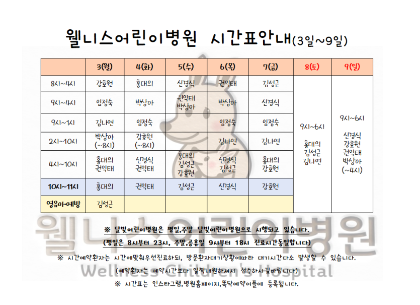 11월3일~9일 시간표입니다. > 월 진료 시간표