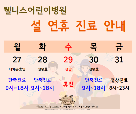 1/29 설연휴 당일은 휴진하오니 내원시 참고하시기 바라며 31일부터는 정상진료입니다.