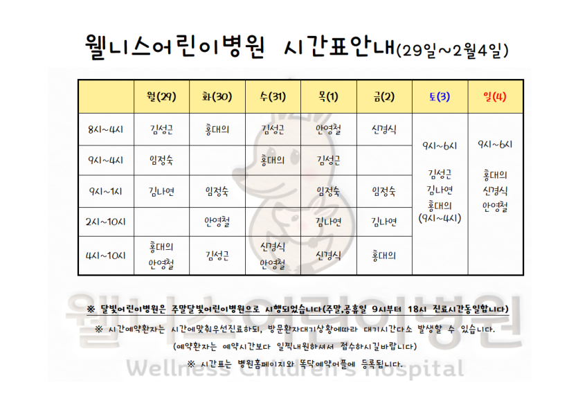 1월29~2월4일시간표입니다. > 월 진료 시간표