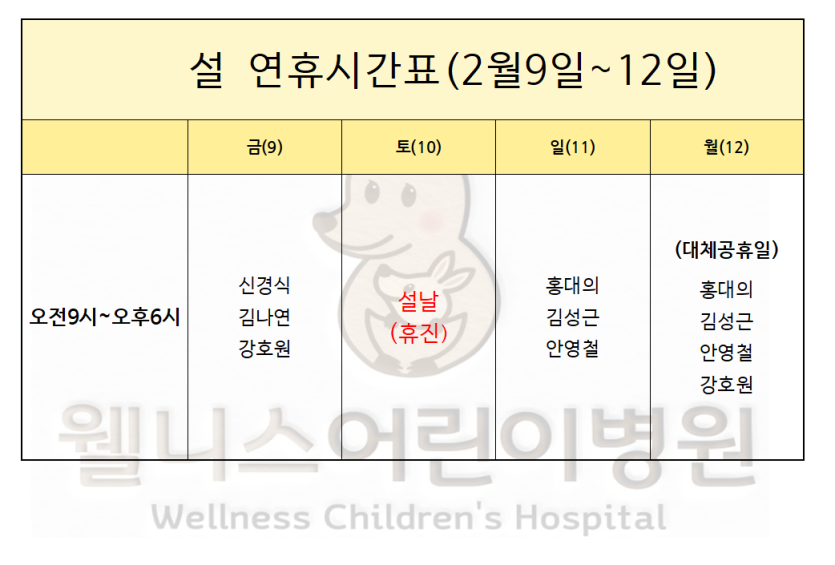 설연휴시간표입니다.(2월9일~12일)