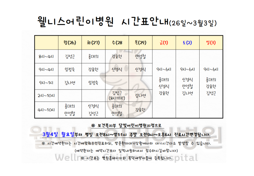 2월 26일~3월3일시간표입니다. > 월 진료 시간표