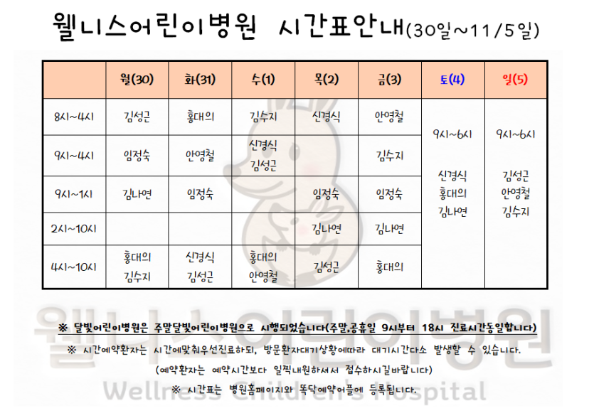 10월30일~11월5일시간표입니다. > 월 진료 시간표