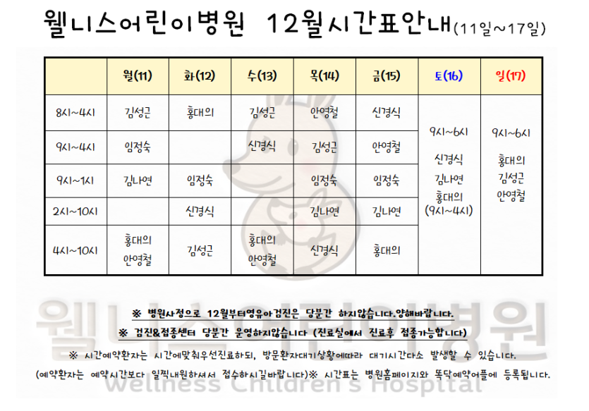 12월11일~17일시간표입니다. > 월 진료 시간표
