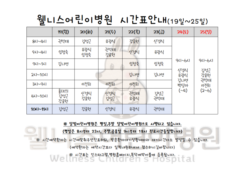 1월19일~25일 시간표입니다. > 월 진료 시간표